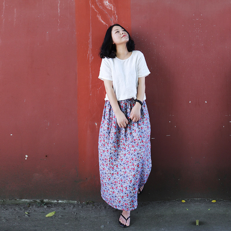 原创设计春夏季新款文艺复古a字显瘦气质棉麻数码印花碎花半身裙热门设计联盟服务商